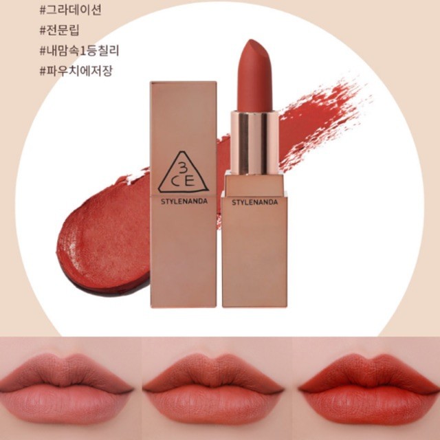 Các bảng màu son của 3CE luôn là điều được quan tâm nhiều nhất. Dòng son kem lì đang được ưa chuộng bậc nhất, với một lớp son lì mịn trên môi, lâu trôi và lên màu chuẩn - 3CE Velvet Lip Tint là bộ sưu tập son kem lì đình đám nhất thị trường thời gian vừa qua đến từ thương hiệu 3CE Stylenanda. Đây là thỏi son vỏ nhung có màu cam đỏ đất vô cùng lạ, quyến rũ và rực rỡ.