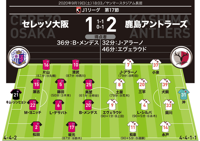 J1採点 寸評 C大阪1 2鹿島 Momは3戦連発 勝負強さを見せつけたエース 6連勝の鹿島は軒並み高評価に サッカーダイジェストweb